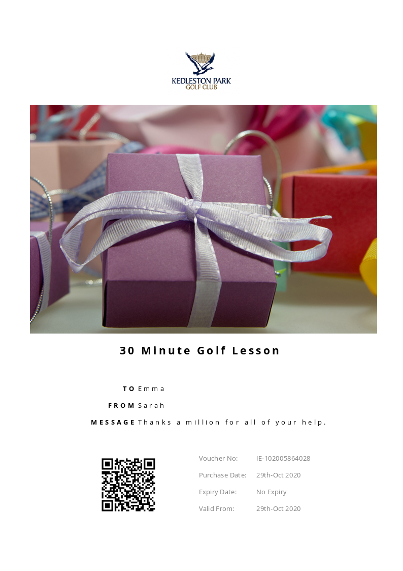 Please contact us at Kedleston Park Golf Club on 01332 840035 to make your booking. 1. You must present the gift voucher in the establishment upon arrival. 2. Gift Vouchers cannot be extended, are non-transferable and non-refundable. 3. When making a reservation please notify the business of your intent to use a voucher. 4.Your voucher code is unique to you, it is your responsibility to not disclose this code to others. 5. All bookings are subject to availability and change. 6. Gift Vouchers are valid from the date of purchase until the expiry date.